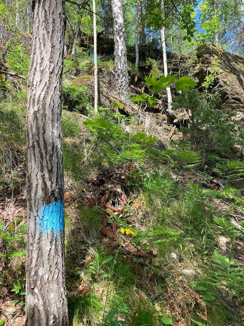 For å komme ned mot Li, følg blå-merking mot nord. Etter ca 200 m kommer du da inn på traktorveg, som leder ned mot Li.